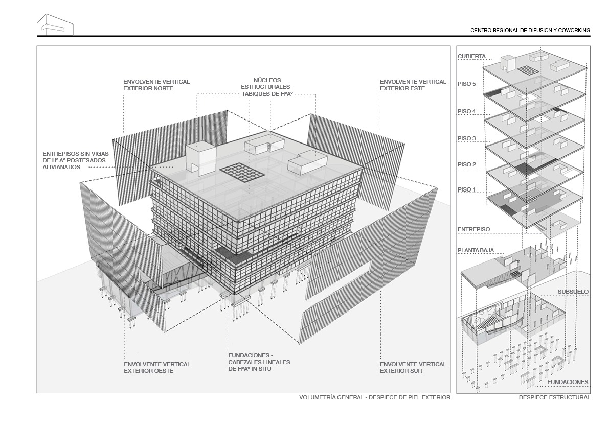 En este caso particular, se desarrolla un Centro de Difusión y Coworking que ofrece una alternativa al sistema de trabajo tradicional, por lo que aborda el tema de los nuevos modos de trabajo. Un proyecto que busca posicionarse como nueva cabecera para la ciudad de Santa Rosa en la región, y con una propuesta de urbanización para su terreno ferroviario, consistiendo el mismo en una nueva centralidad que favorezca la apropiación de los nuevos espacios propuestos por parte de los usuarios directos y de la región en su conjunto, un espacio representativo para su comunidad y su historia.